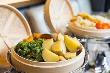 朝食は品数が多くて驚きですよ!蒸し野菜やカレーやシチューが美味しいです。